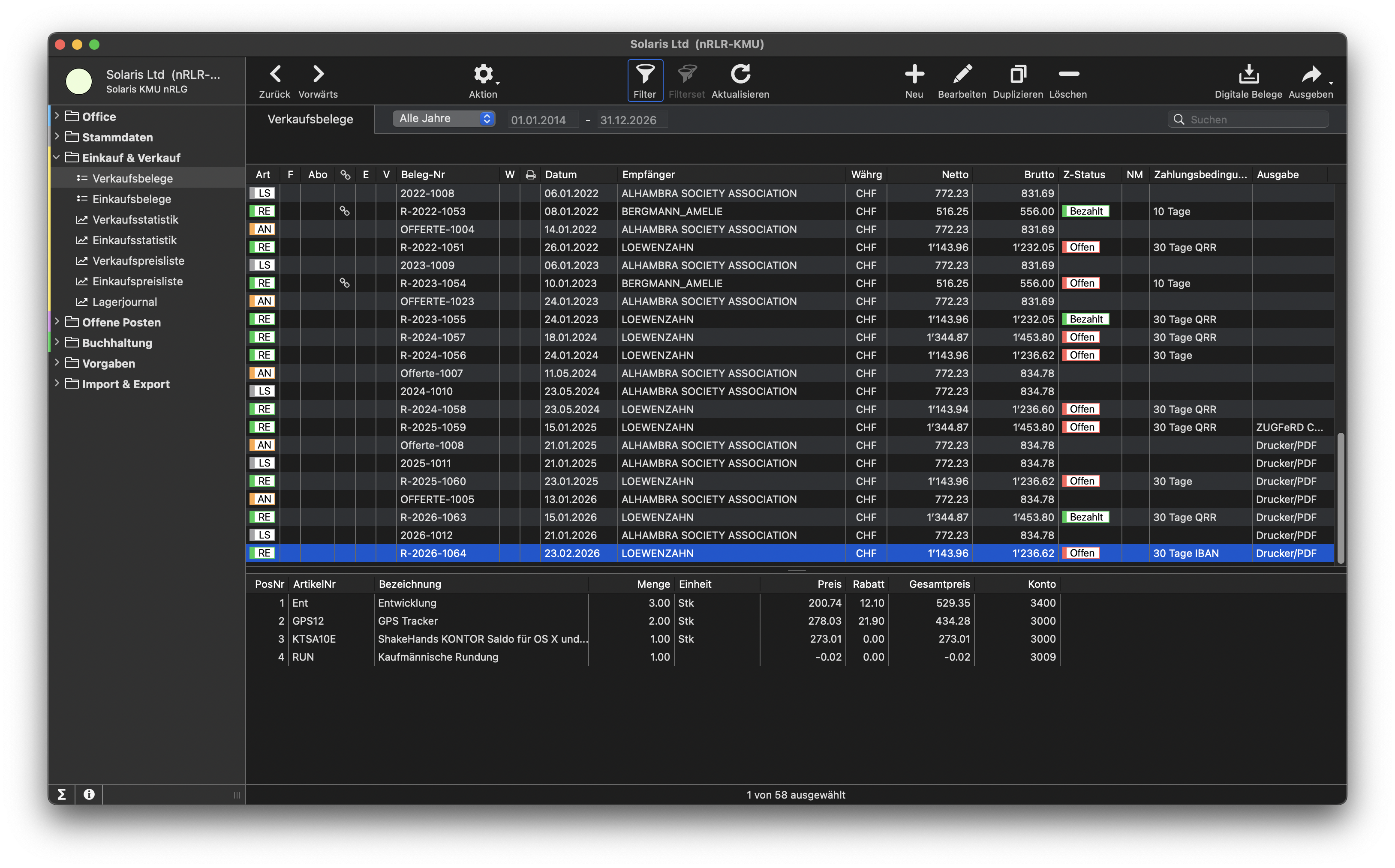 Kaufmännische Komplettlösung mit den Bereichen Auftrags- und Bestellwesen, Lagerverwaltung mit Bestandesführung, Offene Posten Verwaltung mit Debitoren mit Mahnwesen und Verwaltung Kreditoren inklusive Zahlungswesen sowie Finanzbuchhaltung. Mit den shakehands Kontor Modulen Saldo, Balance und Basis von shakehands Kontor.