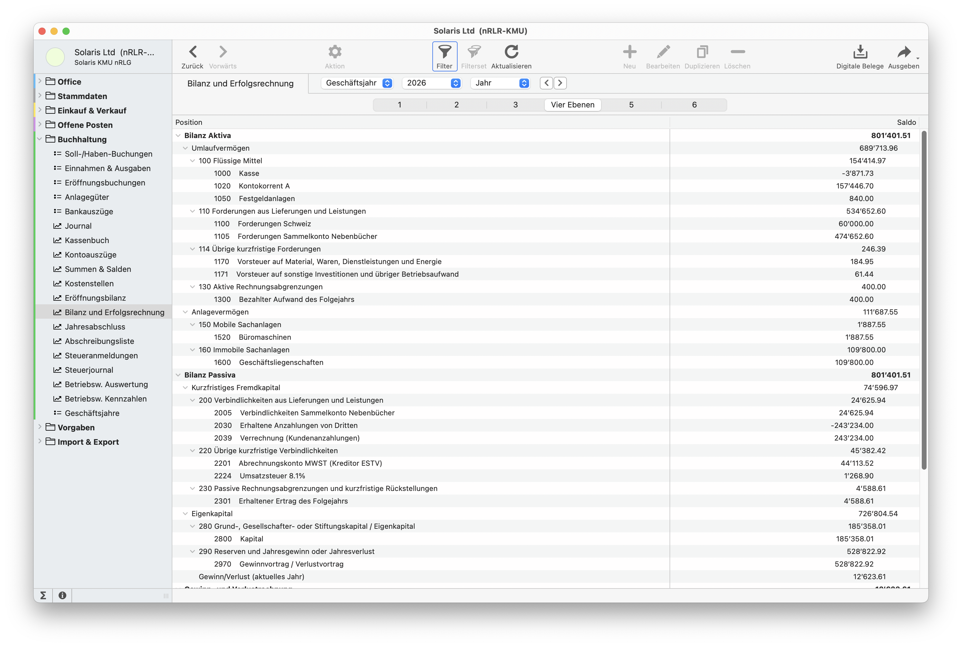 Die Nebenbücher enthalten das Zahlungswesen für Kreditoren und die Offenen Posten Liste nach ISO-Norm für CH- und SEPA-Zahlungen. Auf der Kundenseite finden Sie die Debitoren mit Offenen Posten inklusive einem 4-stufigen Mahnwesen für fällige, nicht bezahlte Rechnungen. Die Ergebnis-Auswertungen wie Bilanzen, Erfolgsrechnungen oder MwSt-Abrechnungen sind per Mausklick erzeugt. Darüber hinaus verwalten Sie Anlagen und erzeugen taggenau Abschreibungsbuchungen. Mit Fremdwährungen und grafischen Kennzahlenauswertungen und der Kostenstellenverwaltung sowie den Zahlen-Cockpits haben Sie weitere mächtige Funktionen, wenn diese notwendig werden. Buchen Sie tagesaktuell und halten Sie Soll und Haben zeitnah im Griff. Neue Funktion: E-Rechnung in den Formaten ZUGFeRD/Factur-X/XRechnung als Kreditorenrechnung in Offene Posten einlesen.